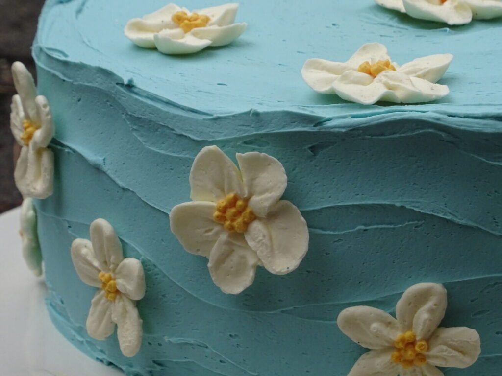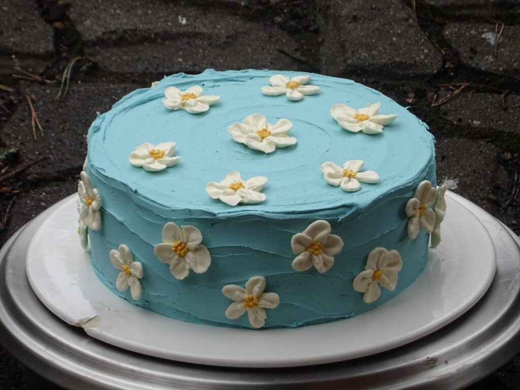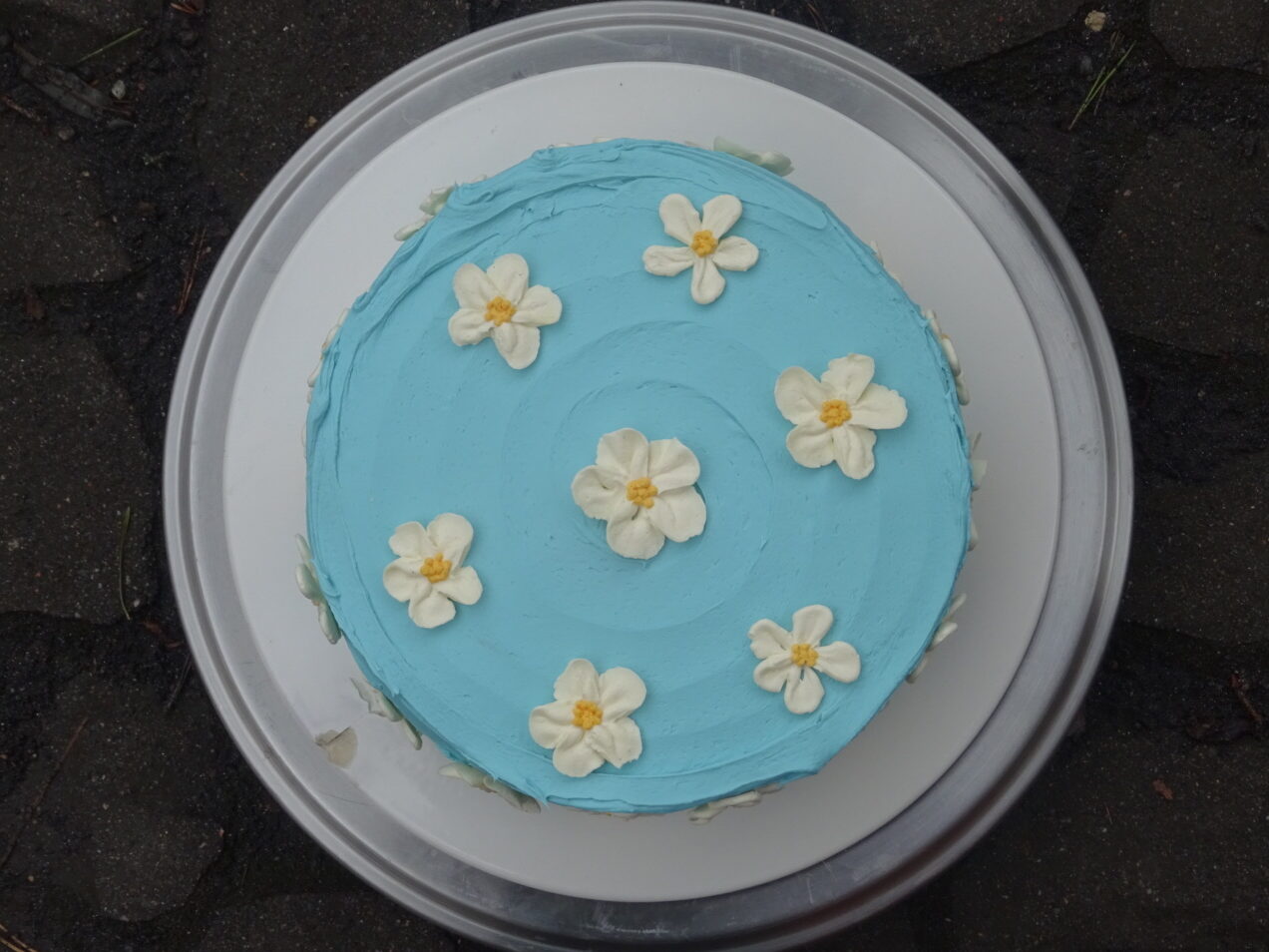 4. Levitä valkosuklaakuorrutetta ohuelti koko kakulle esimerkiksi veitsellä. Jos omistat palettiveitsen, käytä sitä. Anna jähmettyä jääkaapissa.